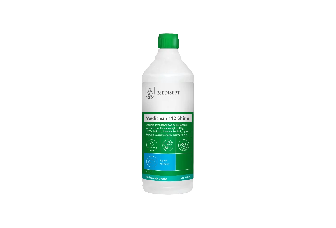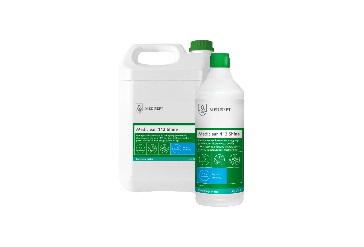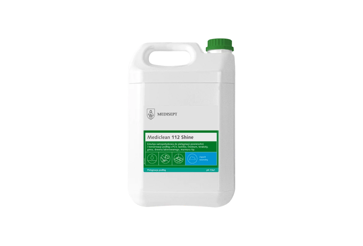 Profesjonalna emulsja samopołyskowa przeznaczona do bieżącej pielęgnacji i konserwacji podłóg z PCV, kamienia, gresu, terakoty, marmuru oraz drewna lakierowanego. Mediclean 112 Shine nadaje powierzchni estetyczny połysk, właściwości antystatyczne i antypoślizgowe, przeciwdziałając osadzaniu się kurzu i chroniąc podłogę przed zużyciem.