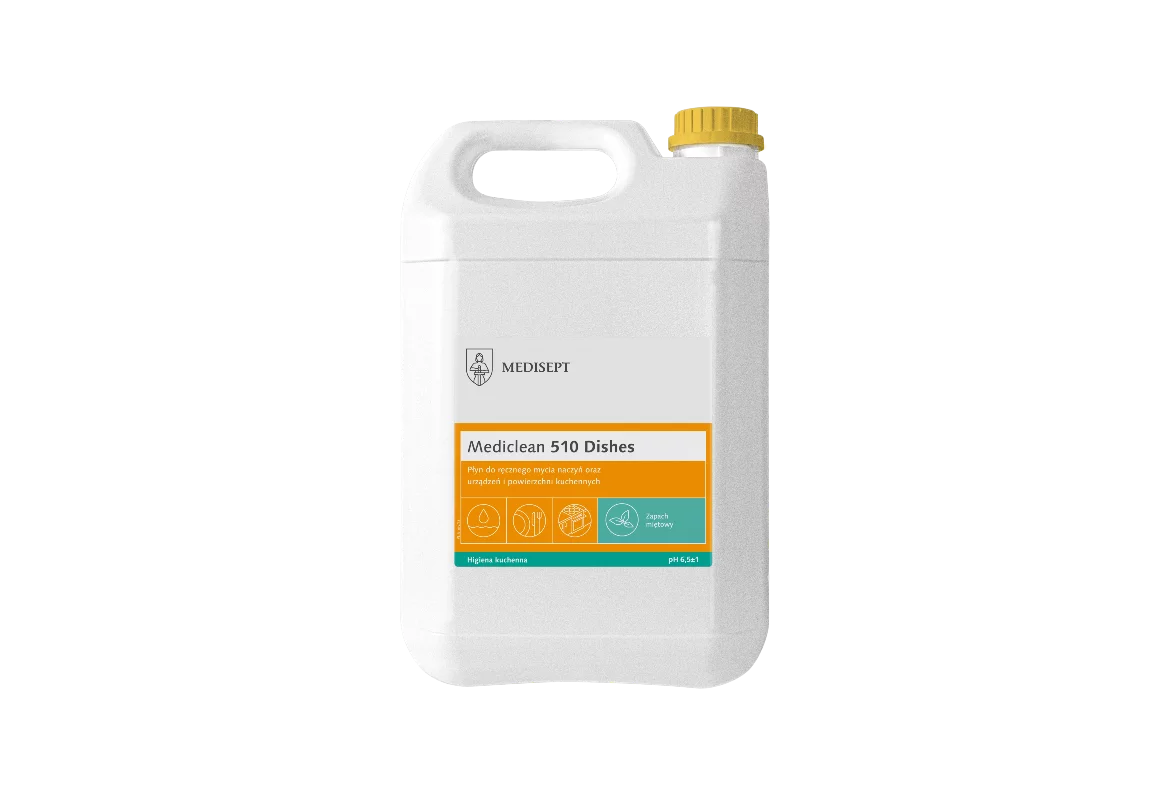 Mediclean 510 Dishes to skoncentrowany płyn do ręcznego mycia naczyń, sztućców, urządzeń i powierzchni kuchennych. Doskonale usuwa tłuszcz i zabrudzenia, nie pozostawiając smug ani zacieków. Dzięki dodatkowi pochodnej olejku kokosowego chroni dłonie przed podrażnieniami i przesuszeniem.