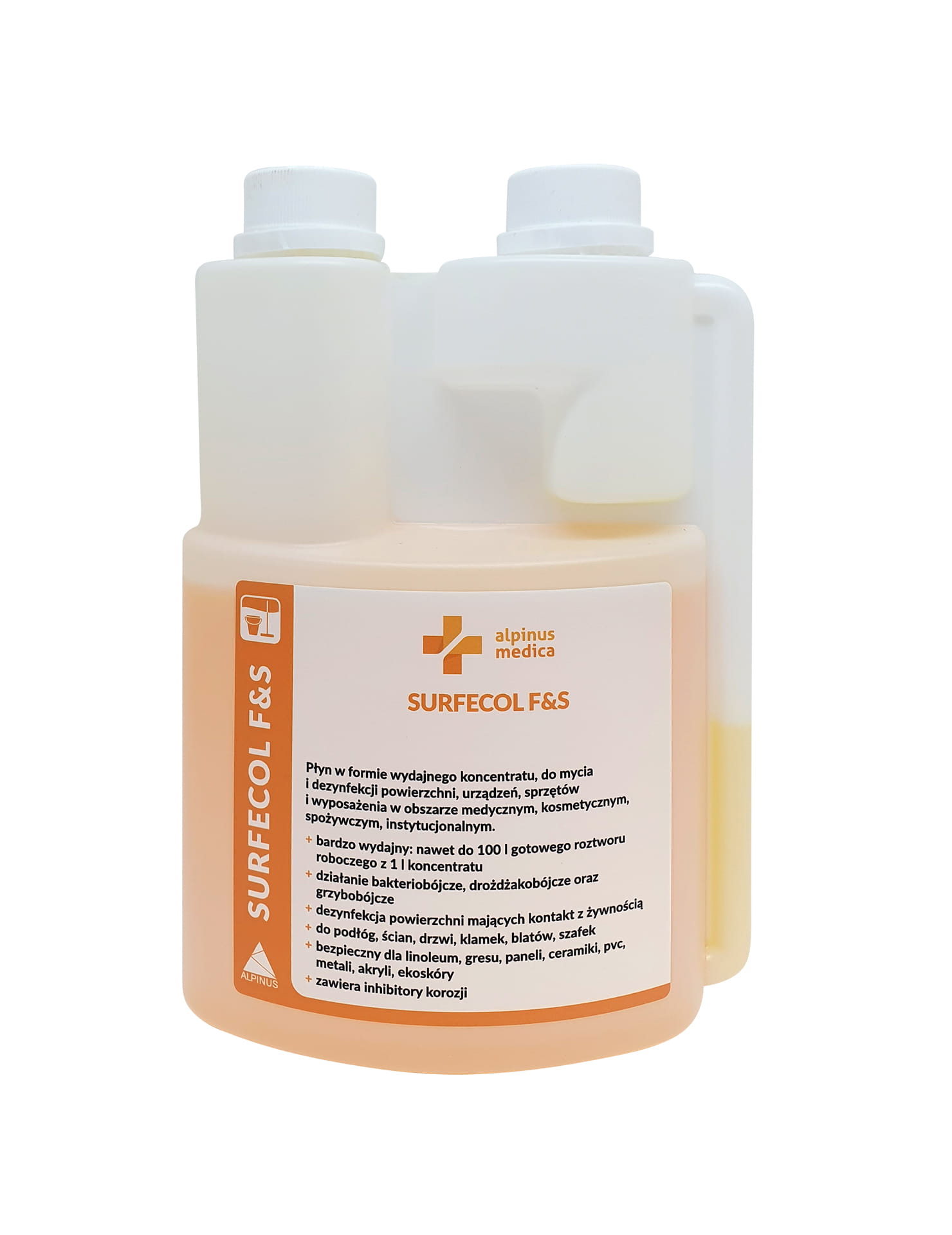 Surfecol F&S to profesjonalny płyn w formie koncentratu, przeznaczony do dezynfekcji i czyszczenia powierzchni w obszarze medycznym, kosmetycznym, spożywczym i instytucjonalnym. Może być stosowany na podłogach, blatach, szafkach, klamkach, drzwiach i wszelkich innych zmywalnych powierzchniach – także tych mających kontakt z żywnością.