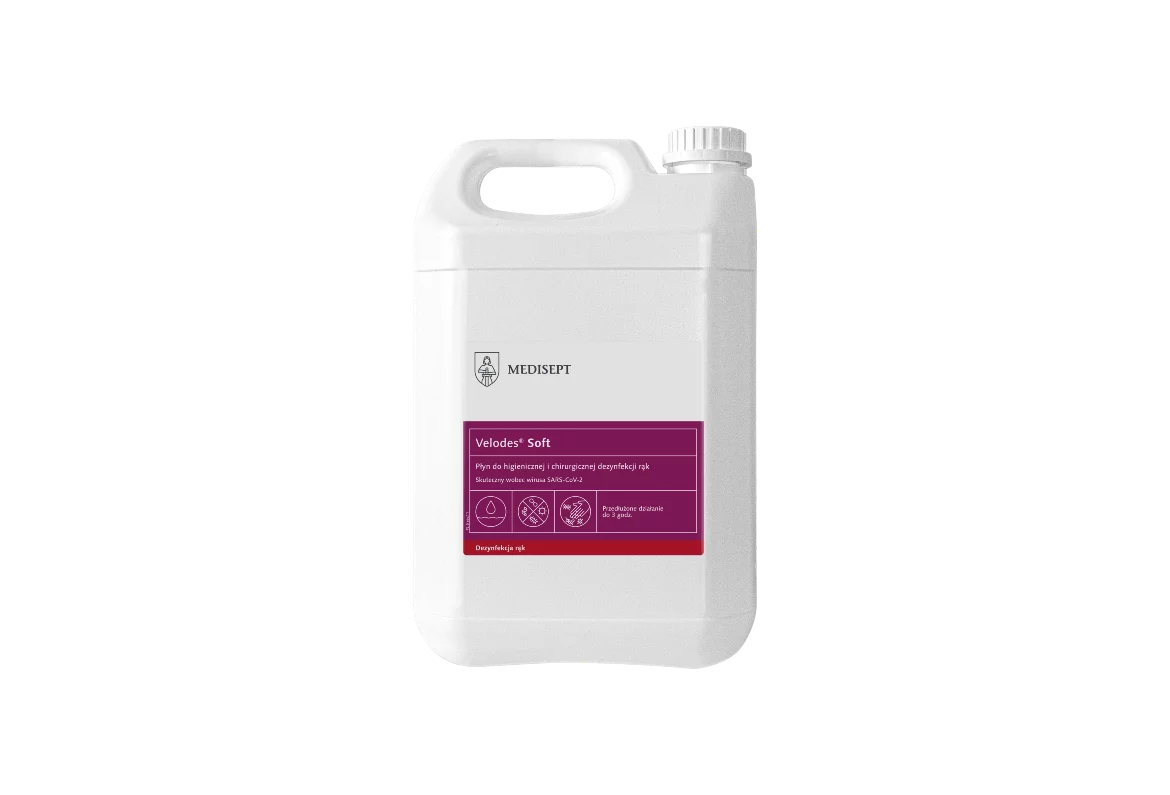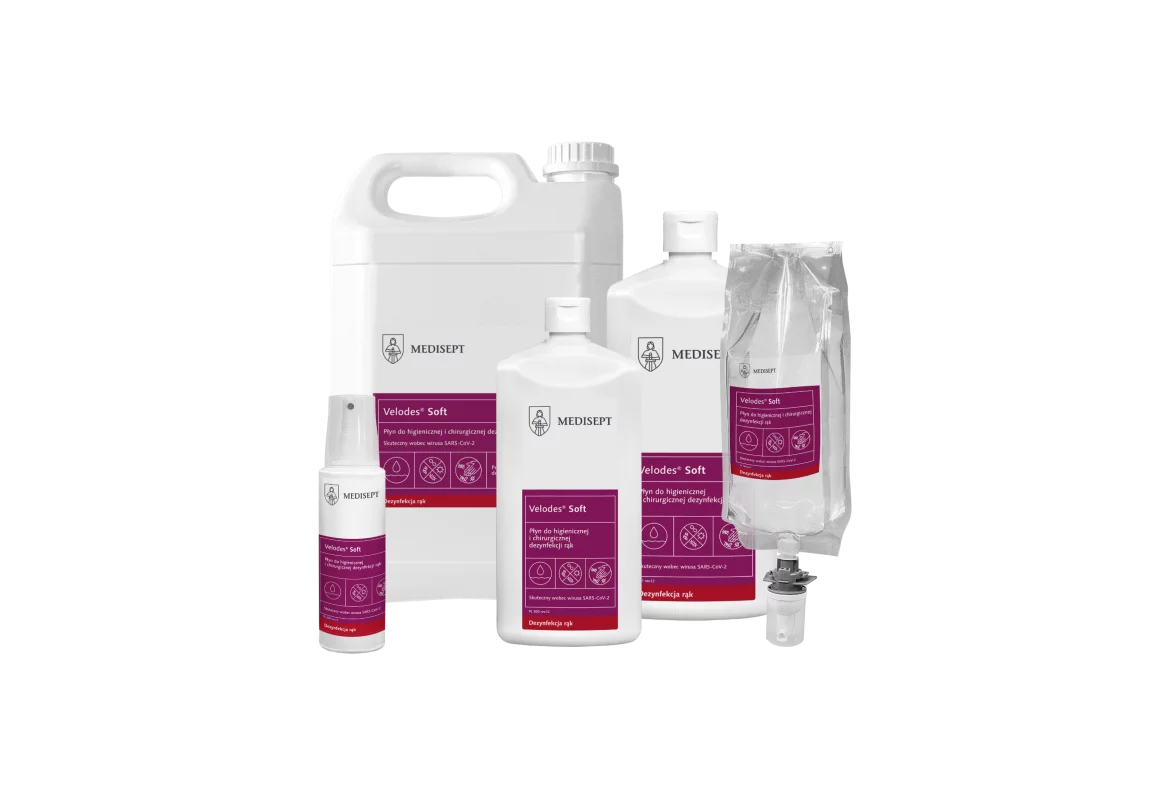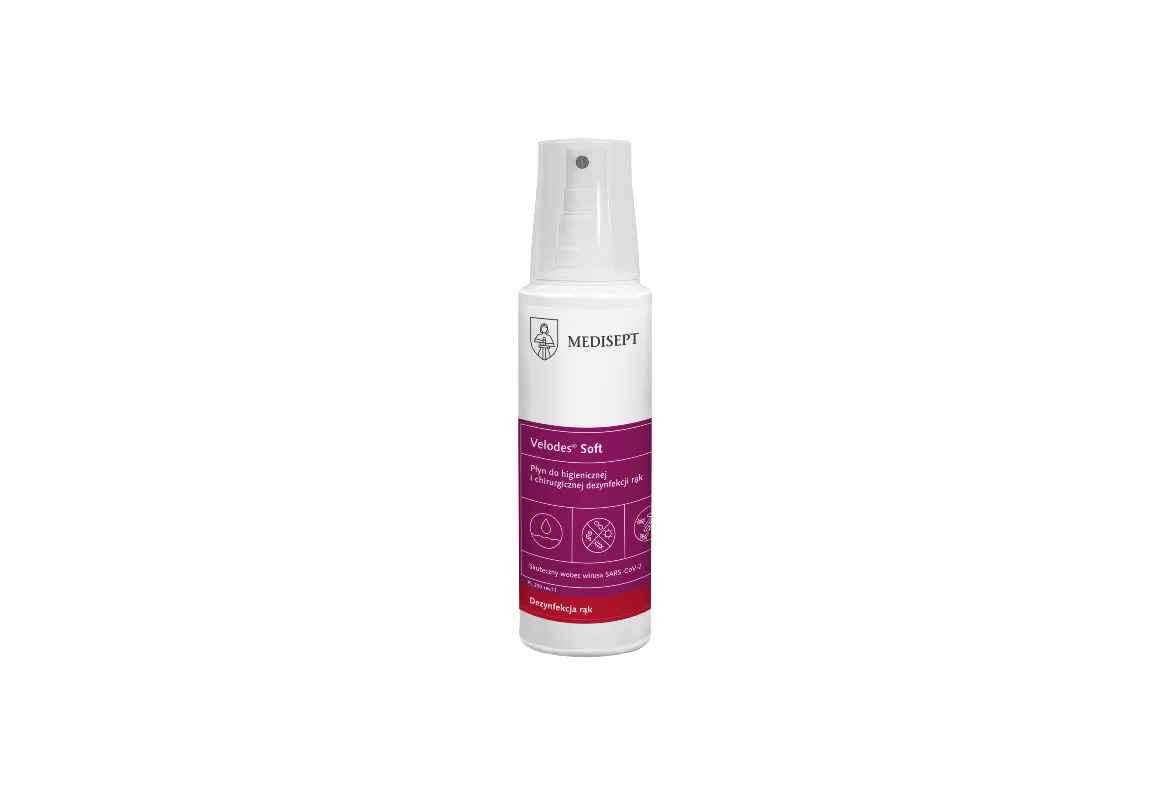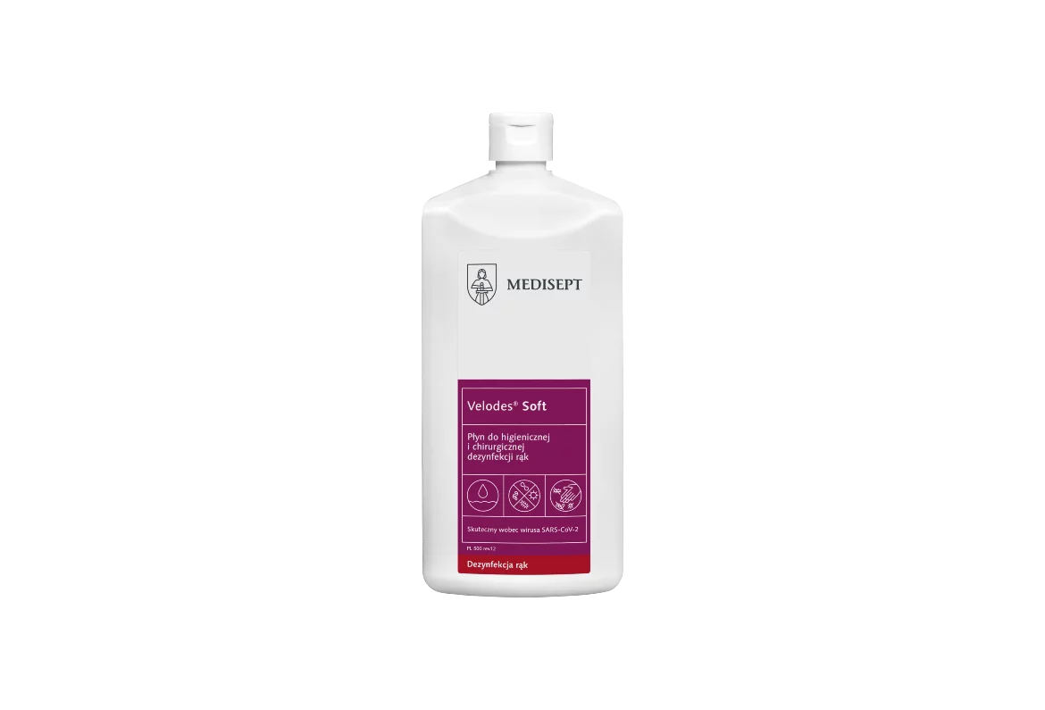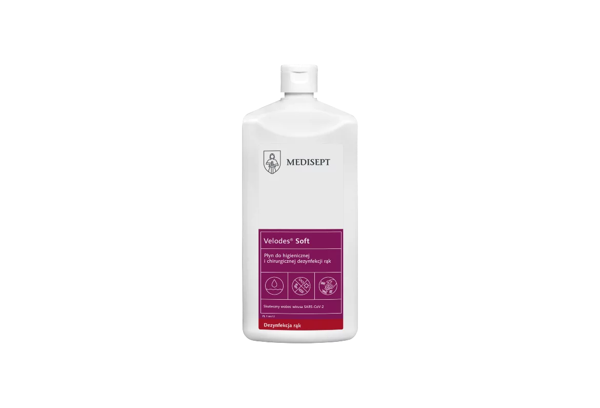 Velodes Soft to alkoholowy płyn gotowy do użycia, przeznaczony do higienicznej i chirurgicznej dezynfekcji rąk. Produkt łączy wysoką skuteczność biobójczą z łagodnym działaniem pielęgnującym. Dzięki zawartości propan-2-olu oraz glukonianu chlorheksydyny skutecznie neutralizuje bakterie, wirusy (również Rota, HIV, HBV, HCV) oraz grzyby, zachowując jednocześnie bezpieczeństwo dla skóry – potwierdzone badaniami dermatologicznymi.