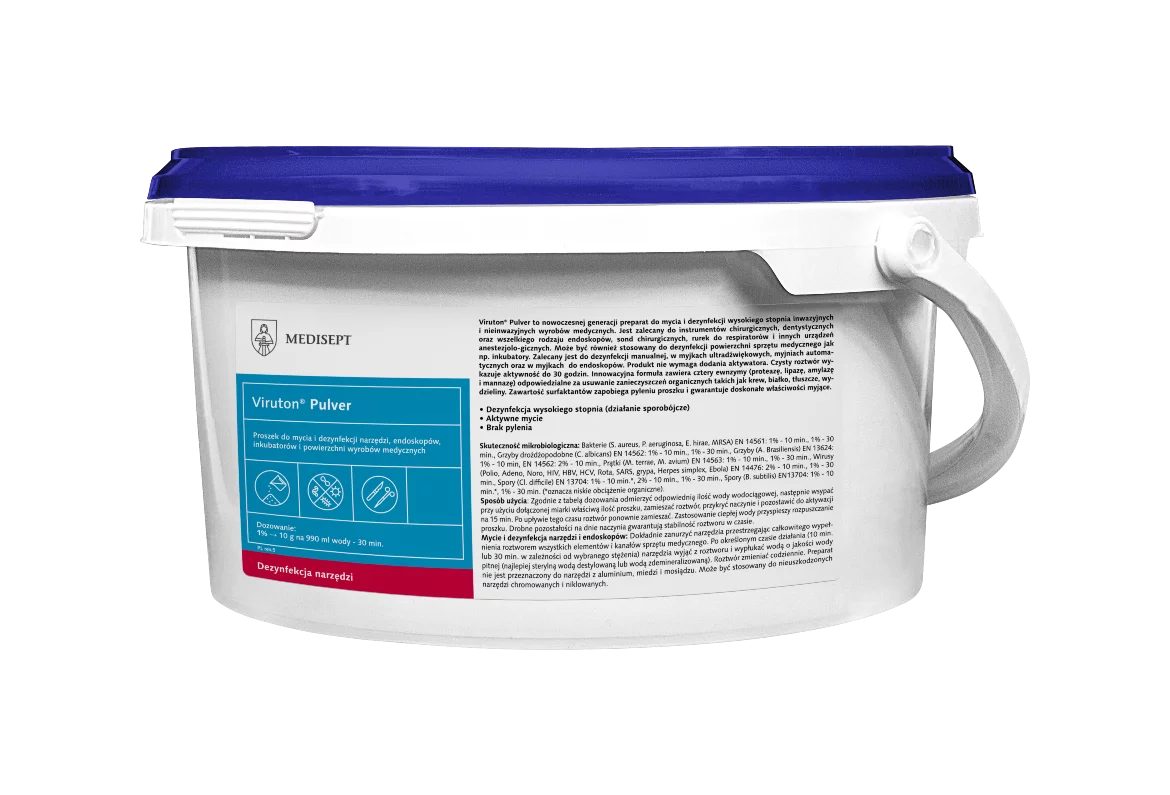 Viruton Pulver to profesjonalny, enzymatyczny proszek przeznaczony do mycia i dezynfekcji narzędzi chirurgicznych, endoskopów, inkubatorów i powierzchni sprzętu medycznego. Preparat zapewnia wysoką skuteczność dezynfekcyjną i myjącą już w 1% roztworze – działa w zaledwie 30 minut. Nie wymaga stosowania aktywatora, jest bezpyłowy, a jego formuła oparta na 4 enzymach skutecznie rozpuszcza i usuwa nawet zaschnięte zabrudzenia organiczne.