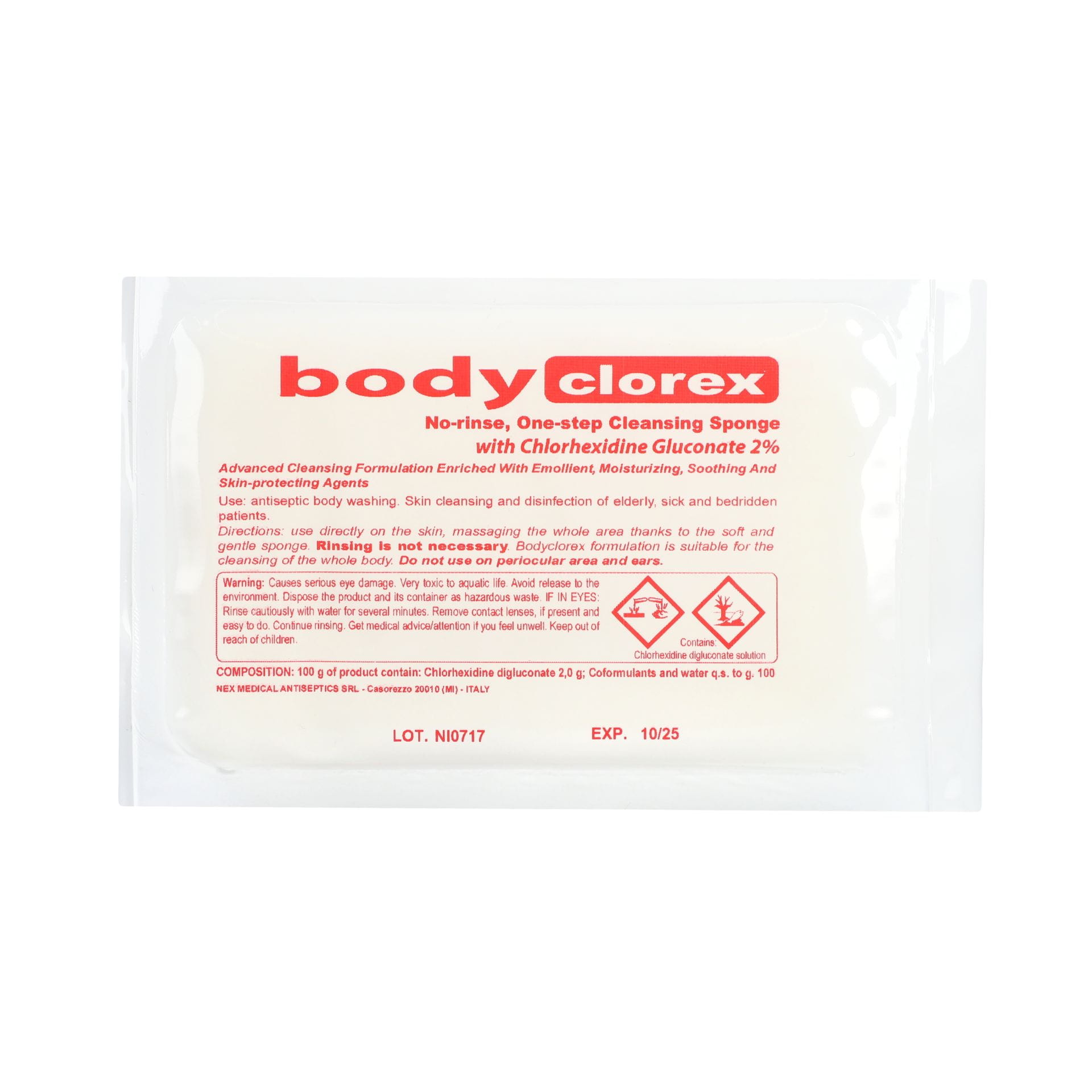 BodyCLOREX 2% to jednorazowa, miękka gąbka poliuretanowa nasączona 25 ml oczyszczającej pianki z dodatkiem 2% roztworu diglukonianu chlorheksydyny. Formuła działa szybko i skutecznie, zapewniając szerokie spektrum działania biobójczego, dzięki czemu produkt idealnie nadaje się do higieny pacjentów wymagających szczególnej ochrony.